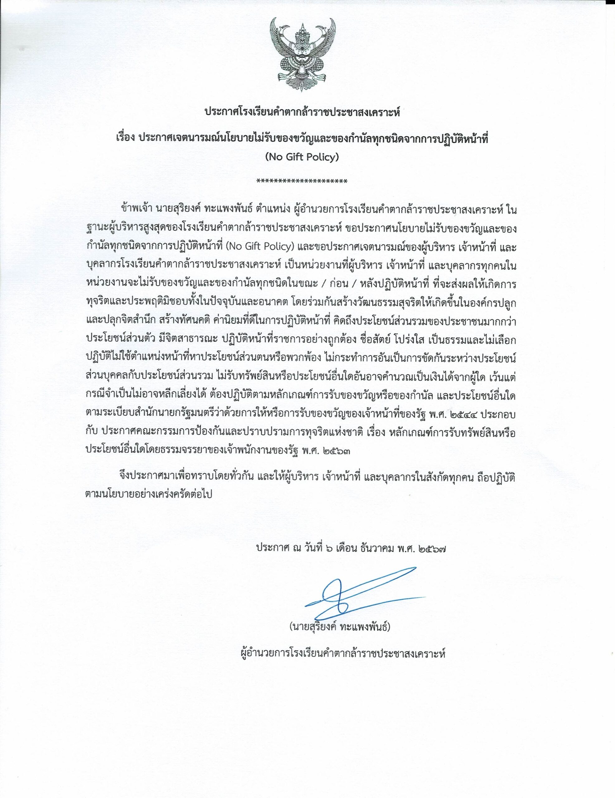 ประกาศโรงเรียนคำตากล้าราชประชาสงเคราะห์ เรื่อง แจ้งปิดเรียนกรณีพิเศษ ระหว่างวันที่ 14 – 15 มกราคม 2569