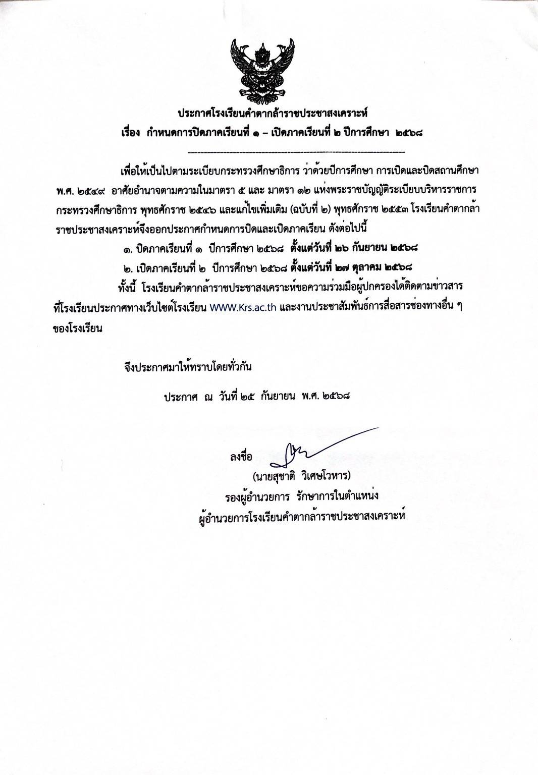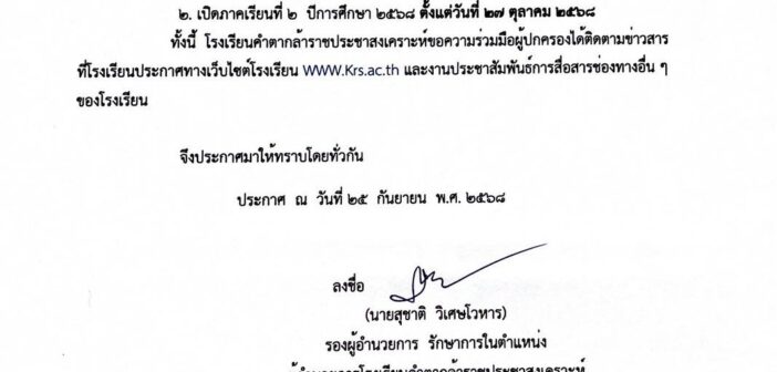 กำหนดการปิดภาคเรียนที่ ๑ – เปิดภาคเรียนที่ ๒ ปีการศึกษา ๒๕๖๘ 0 โดย webmaster on 25 กันยายน 2025 Uncategorized แชร์ : Twitter Facebook Pinterest LinkedIn Tumblr Email